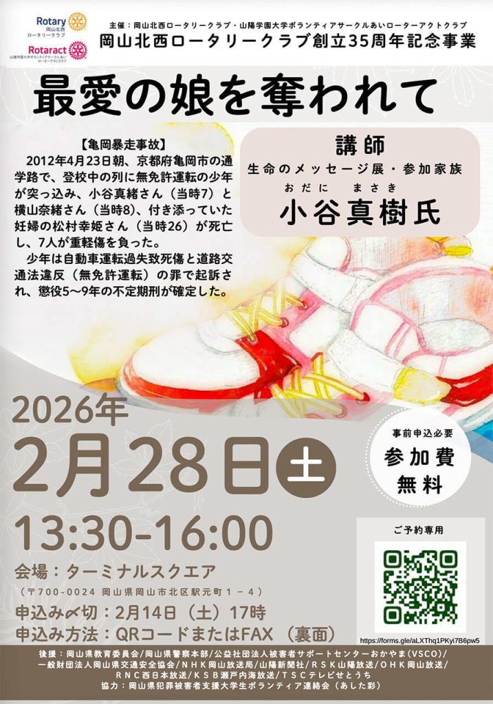 この度 この事故で愛娘(小谷真緒さん当時7歳)が犠牲となったご遺族小谷真樹氏による基調講演等を開催いたします。