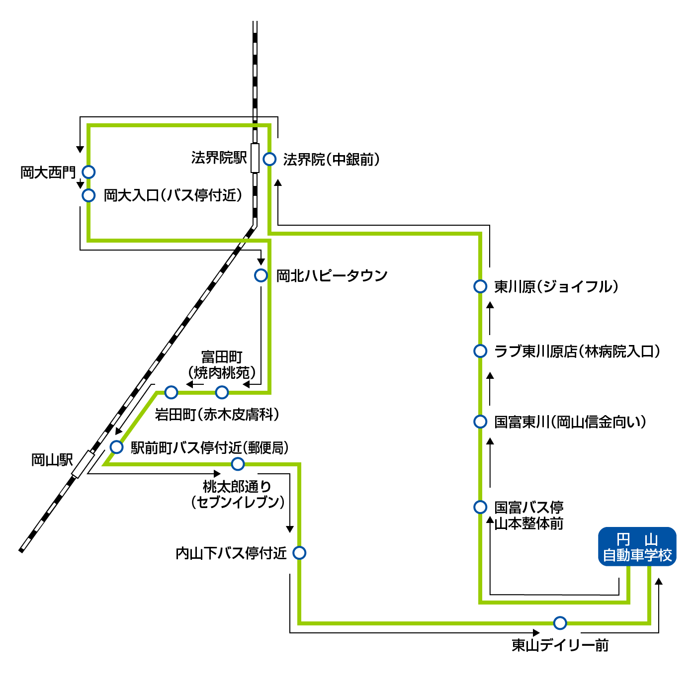 ※2便は、岡大から岡山駅方面(岡山駅コース)へ回ります。通常便とコースが違うので、乗り場をよくお確かめのうえ、ご乗車ください。閑散期の土曜・日曜は16:05発の「岡大・岡山駅・大元方面」の送り便になります。